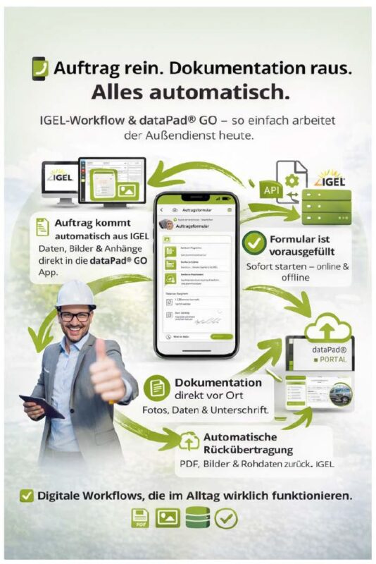 dataPad® GO übernimmt in diesem Zusammenspiel eine zentrale Rolle als operative Brücke zwischen realen Arbeitsprozessen und digitaler Systemlandschaft – und trägt damit zu einer strukturierten, nachhaltigen und anschlussfähigen Digitalisierung bei.