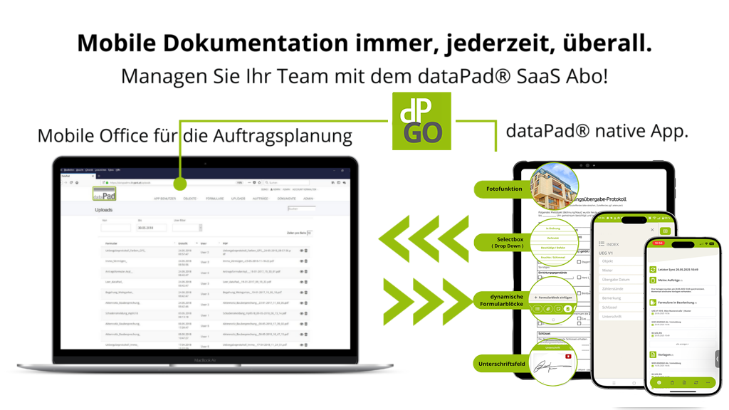 dataPad® bietet Software & native App, für die lückenlose, beweiskräftige Dokumentation, die Sie, für Protokolle und Berichte benötigen – ganz ohne Papier und mit erheblicher Zeitersparnis.